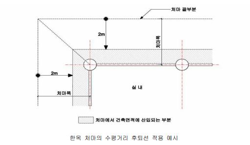 (1) 처마/차양의 길이가 1m이하면 산정하지 않는다(2) 처마/차양의 길이가 1m이상이면 그 끝선에서 1m를 후퇴한 선으로 둘러싸인 부분의 수평투영면적의 산정
